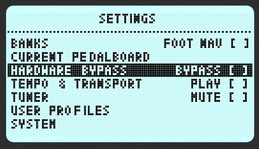 This image shows the left screen of the MOD Duo with the Hardware Bypass menu selected—version 1.13